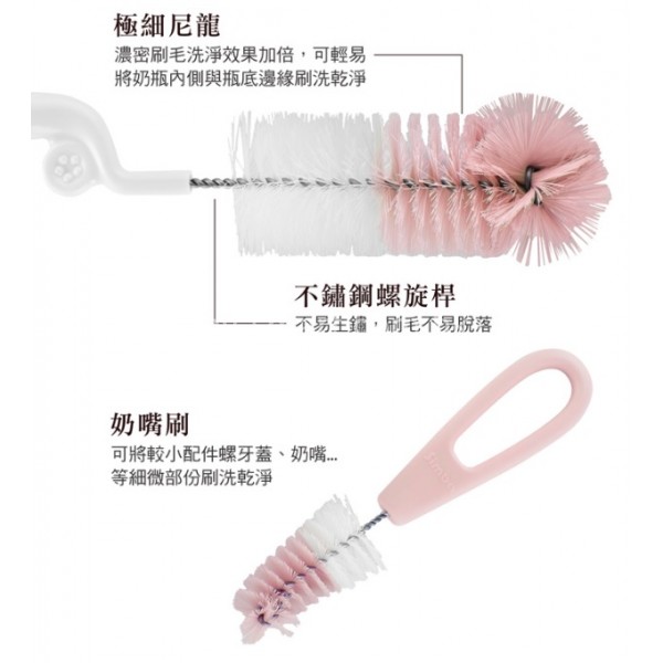 1.尼龍柔軟不刮傷奶瓶,可輕易將奶瓶內側與瓶底邊緣刷洗乾淨,洗淨效果加倍。