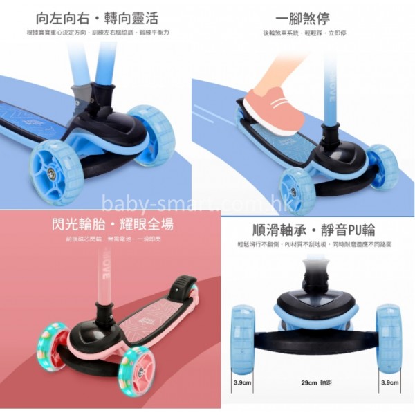 滑板車帶給孩童樂趣及可幫助幼童學習平衡力和協調能力。平隱3輪及寬闊踏板設計。